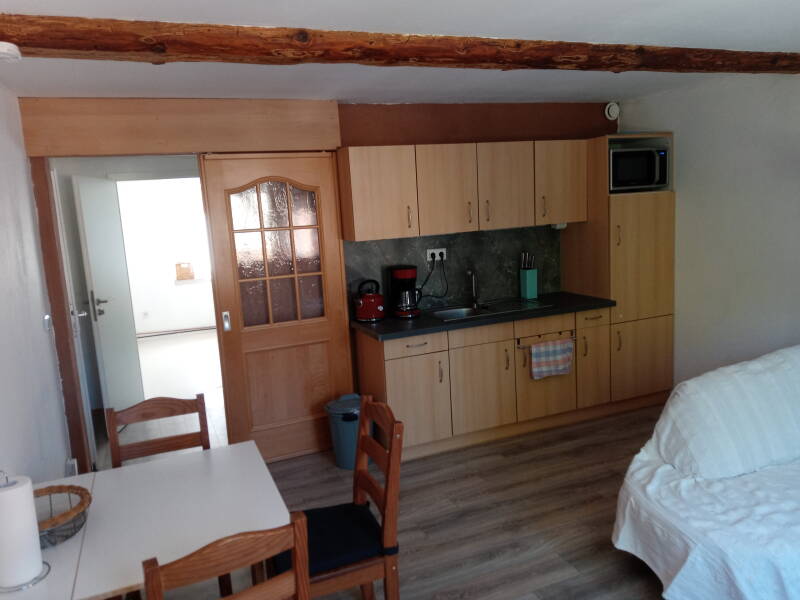 Die Wohnung verfügt über einen Koch-, Wohn- und Essbereich mit Fenster zum Hof, ein abgeschlossenes Schlafzimmer, Bad und Flur. Sie liegt im Erdgeschoss unseres Hauses und ist komplett eingerichtet.