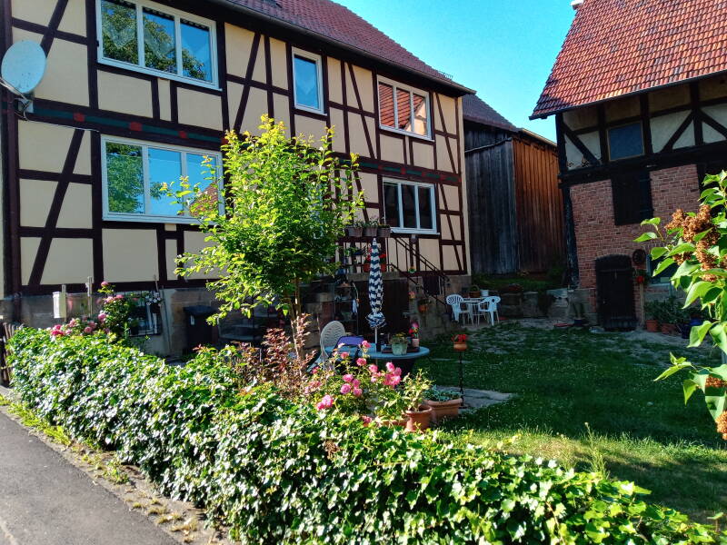 Die Ferienwohnung liegt im historischen Ortskern von Kirchbauna am Ende einer Sackgasse. Zu dem Wohnhaus gehört ein Hof mit einer alten Scheune. Hinter der angrenzenden Wiese fließt die Bauna.